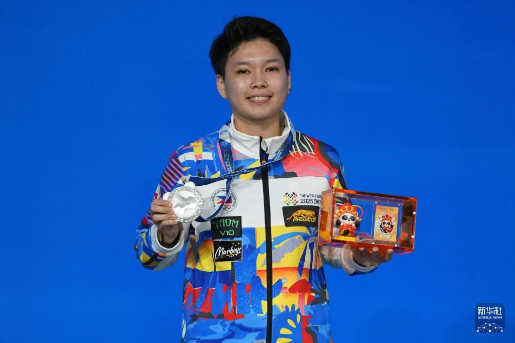 8月14日,女子花式臺球亞軍菲律賓選手森特諾在頒獎儀式上。新華社記者 胥冰潔 攝