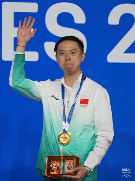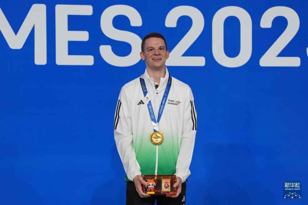8月14日,男子花式臺球冠軍匈牙利選手索爾諾基在頒獎儀式上。新華社記者 胥冰潔 攝