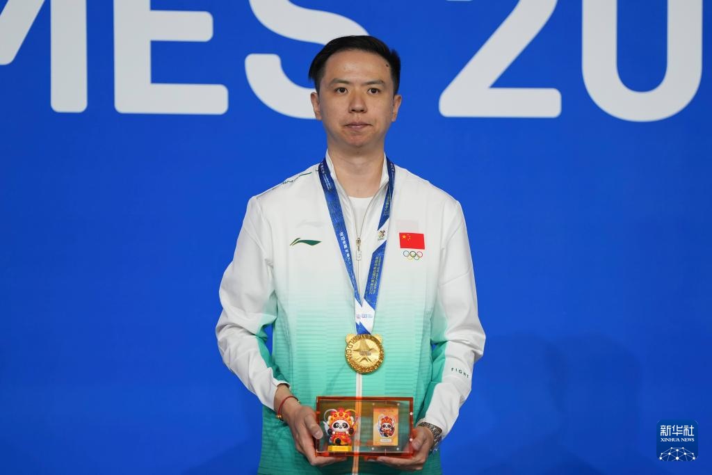 8月14日,臺球男子斯諾克冠軍中國選手肖國棟在頒獎儀式上。新華社記者 胥冰潔 攝