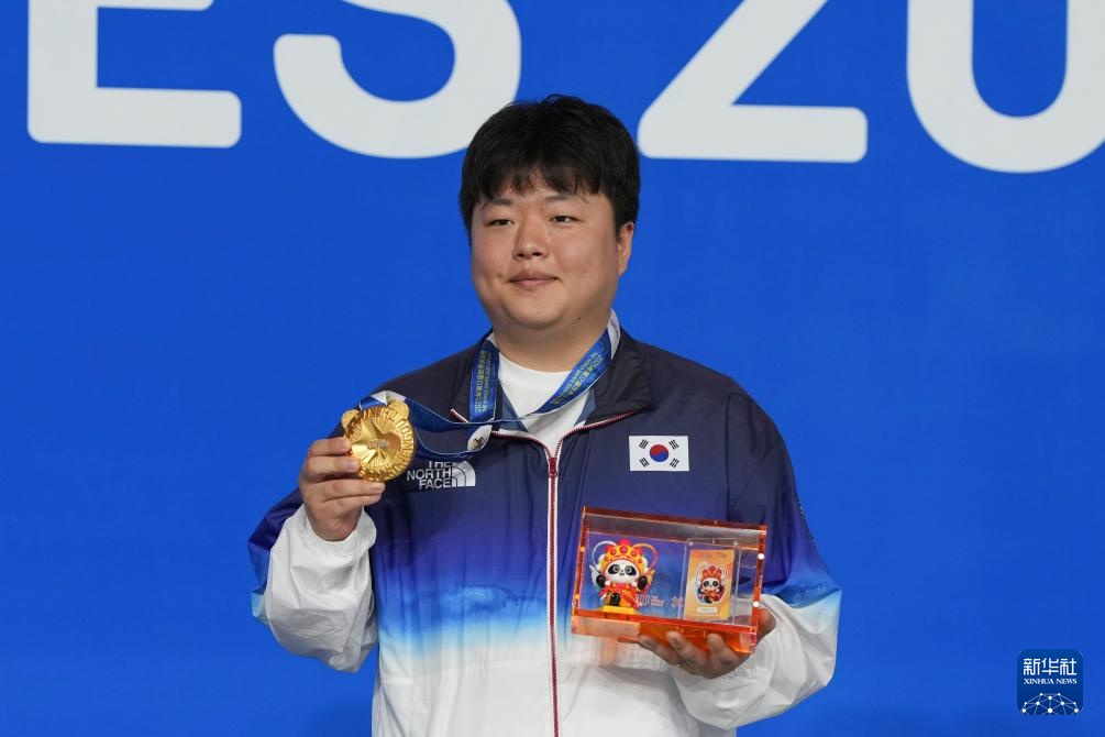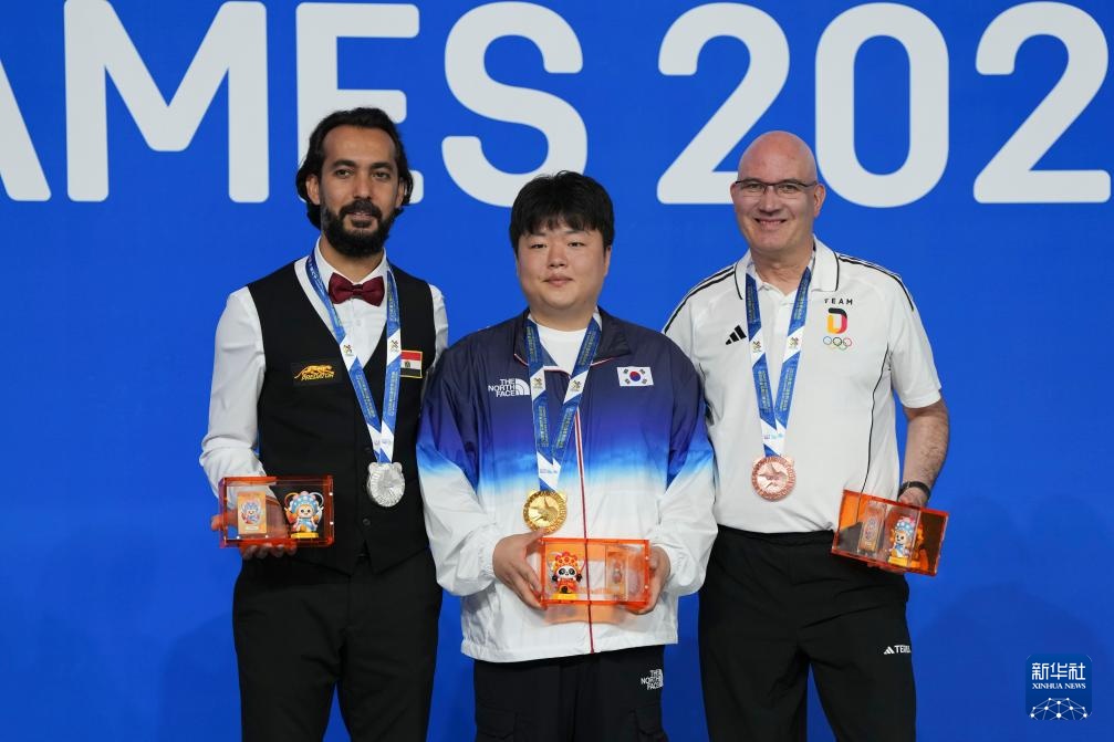8月14日,臺球男子三庫開倫冠軍韓國選手喬名武在頒獎儀式上。新華社記者 胥冰潔 攝