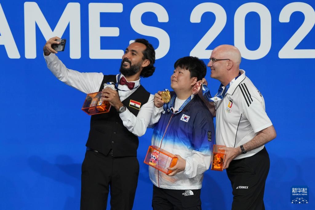 8月14日,臺球八球混合冠軍中國選手張?zhí)┧嚕ㄖ校?、亞軍南非選手塞龍(左)和季軍中國選手唐春曉在頒獎儀式上合影。新華社記者 胥冰潔 攝