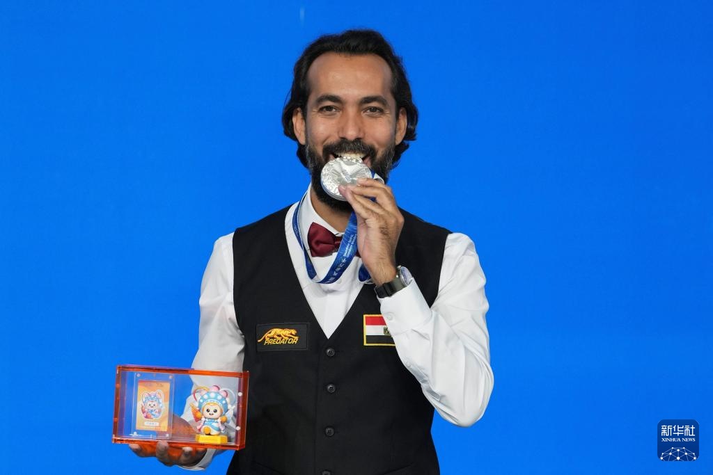8月14日,臺球男子三庫開倫亞軍埃及選手西杜姆在頒獎儀式上。新華社記者 胥冰潔 攝