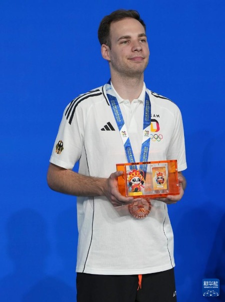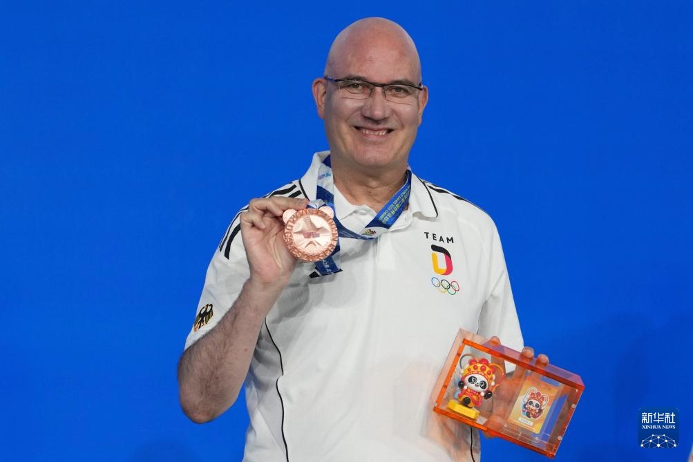 8月14日,男子花式臺球季軍德國選手菲勒在頒獎儀式上。新華社記者 胥冰潔 攝