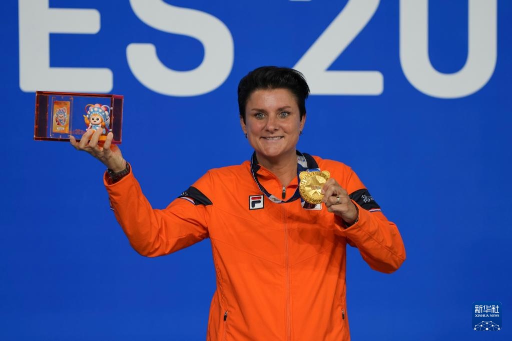 8月14日,臺球女子三庫開倫冠軍荷蘭選手特蕾絲在頒獎儀式上。新華社記者 胥冰潔 攝