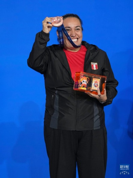 8月14日,臺球女子三庫開倫季軍秘魯選手佩雷斯在頒獎儀式上。新華社記者 胥冰潔 攝
