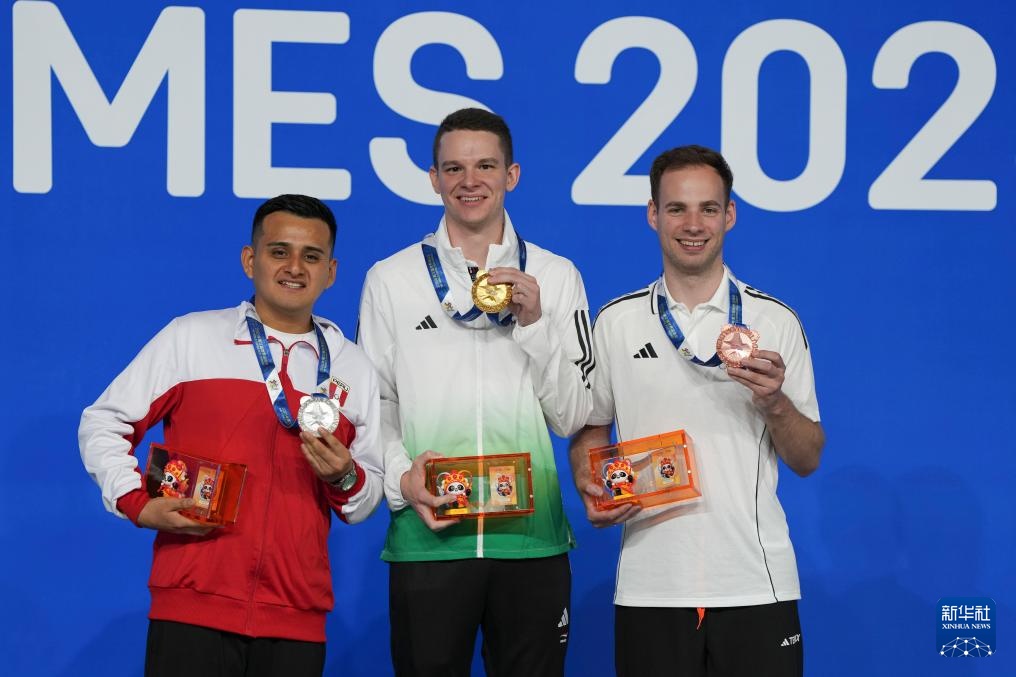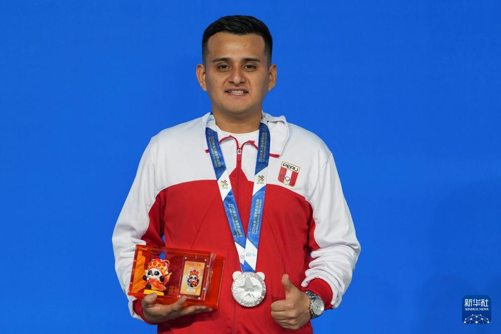8月14日,男子花式臺球亞軍秘魯選手馬丁內斯在頒獎儀式上。新華社記者 胥冰潔 攝