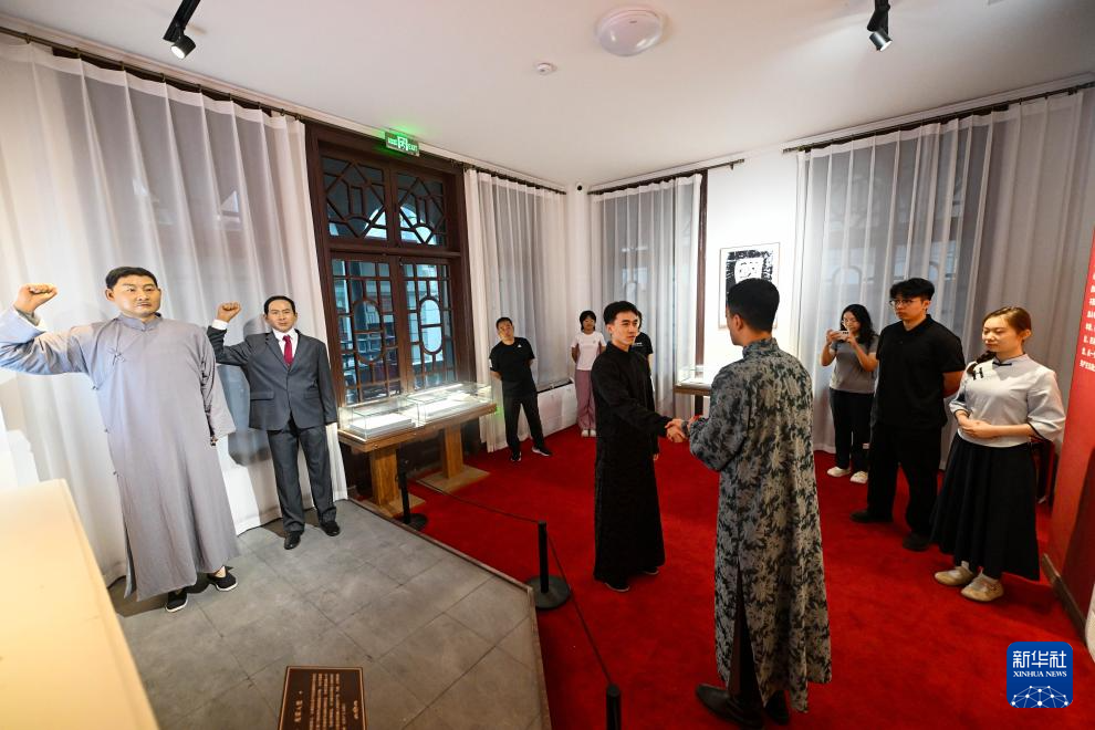 演員在吉鴻昌舊居實(shí)景演繹“光榮入黨”片段(8月16日攝)。新華社記者 趙子碩 攝