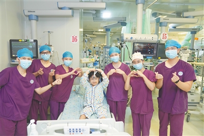 八月十五日,在海南省兒童醫(yī)院兒童重癥醫(yī)學科,醫(yī)護人員和七歲的小欣玥合影留念。海南日報全媒體記者 李天平 攝