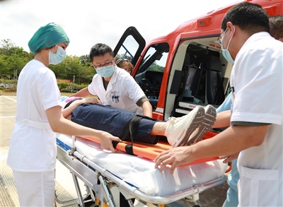 解放軍總醫(yī)院海南醫(yī)院的醫(yī)師在救治直升機(jī)轉(zhuǎn)運(yùn)來的患者。
