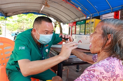 在海棠區(qū)林旺南風(fēng)情小鎮(zhèn),醫(yī)師在為84歲的阿婆開展入戶診療服務(wù)。
