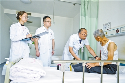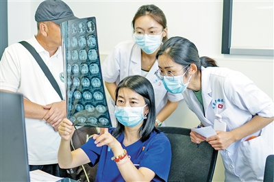 診室內(nèi)的閱片燈映亮出醫(yī)生專注的臉龐,醫(yī)生與患者交流:“您看這里的陰影比上次略大,但邊界還算清楚,咱們討論一下治療方案……”,與此同時,身后的兩位年輕助手也在提筆記錄著。