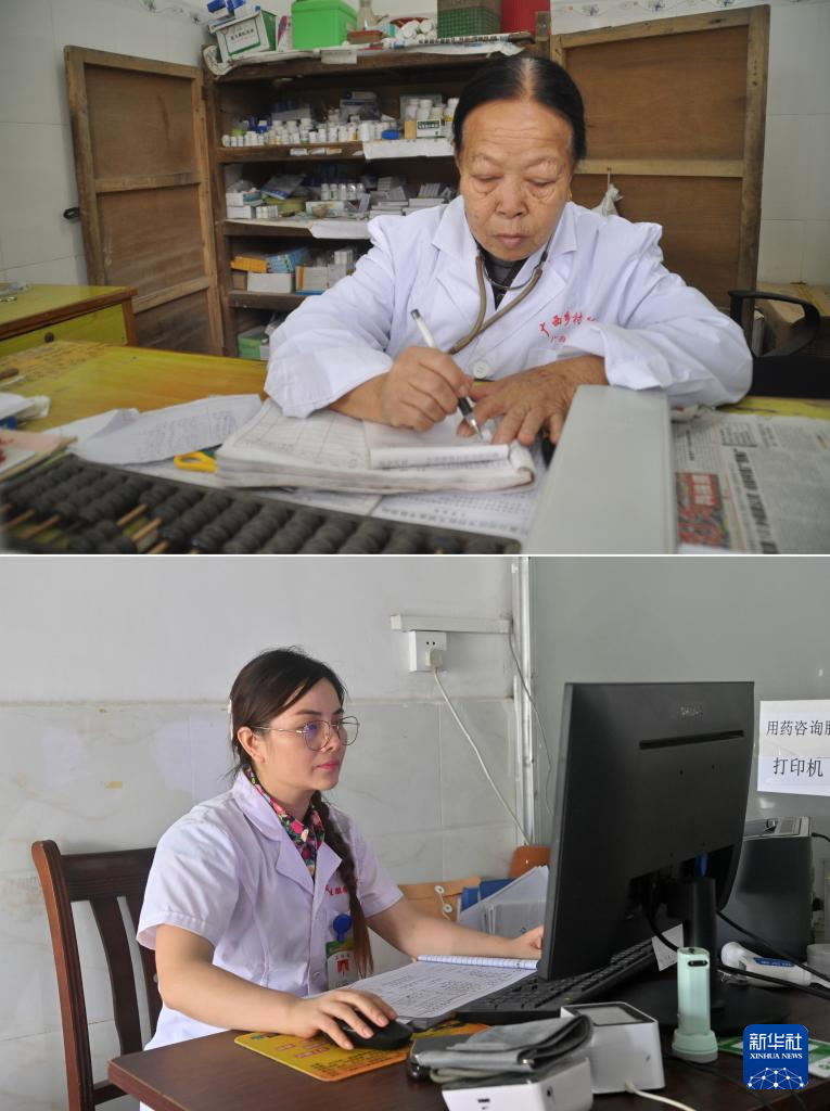 這是一張拼版照片。上圖:杜桂梅醫(yī)生在高嶺村衛(wèi)生室為病人手寫(xiě)處方(2011年12月7日攝)。下圖:潘雪梅醫(yī)生在高嶺村衛(wèi)生室用電腦錄入病人信息(2025年8月18日攝)。新華社記者 陸波岸 攝