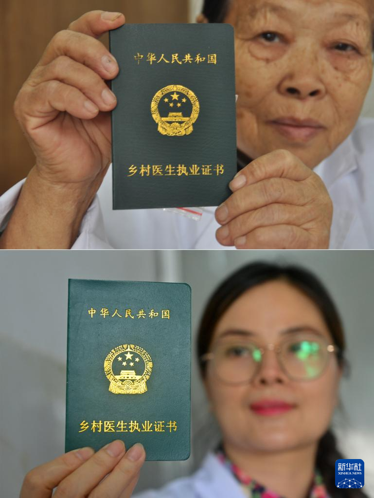 這是一張拼版照片。上圖:杜桂梅醫(yī)生在高嶺村衛(wèi)生室展示自己的鄉(xiāng)村醫(yī)生執(zhí)業(yè)證書(shū)(2011年12月7日攝)。下圖:潘雪梅醫(yī)生在高嶺村衛(wèi)生室展示自己的鄉(xiāng)村醫(yī)生執(zhí)業(yè)證書(shū)(2025年8月18日攝)。新華社記者 陸波岸 攝