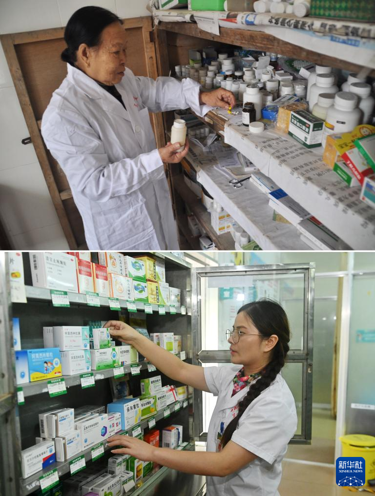 這是一張拼版照片。上圖:杜桂梅醫(yī)生在高嶺村衛(wèi)生室為病人配藥(2011年12月7日攝)。下圖:潘雪梅醫(yī)生在高嶺村衛(wèi)生室為病人找藥品(2025年8月18日攝)。新華社記者 陸波岸 攝