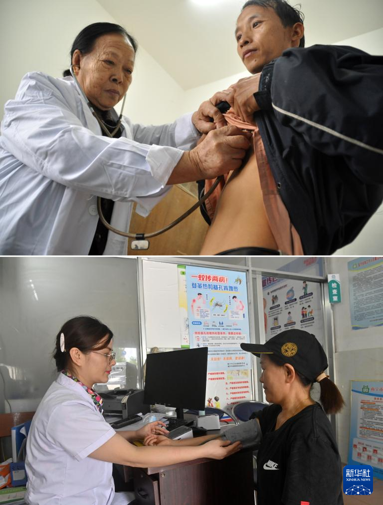這是一張拼版照片。上圖:杜桂梅醫(yī)生(左)在高嶺村衛(wèi)生室為村民檢查身體(2011年12月7日攝)。下圖:潘雪梅醫(yī)生(左)在高嶺村衛(wèi)生室給村民測(cè)量血壓(2025年8月18日攝)。新華社記者 陸波岸 攝
