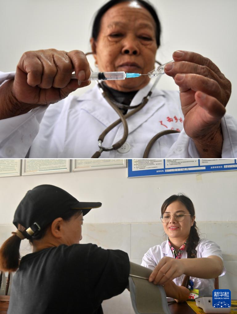這是一張拼版照片。上圖:杜桂梅醫(yī)生在高嶺村衛(wèi)生室準(zhǔn)備給村民打針(2011年12月7日攝)。下圖:潘雪梅醫(yī)生(右)在高嶺村衛(wèi)生室準(zhǔn)備為村民測(cè)量血壓(2025年8月18日攝)。新華社記者 陸波岸 攝