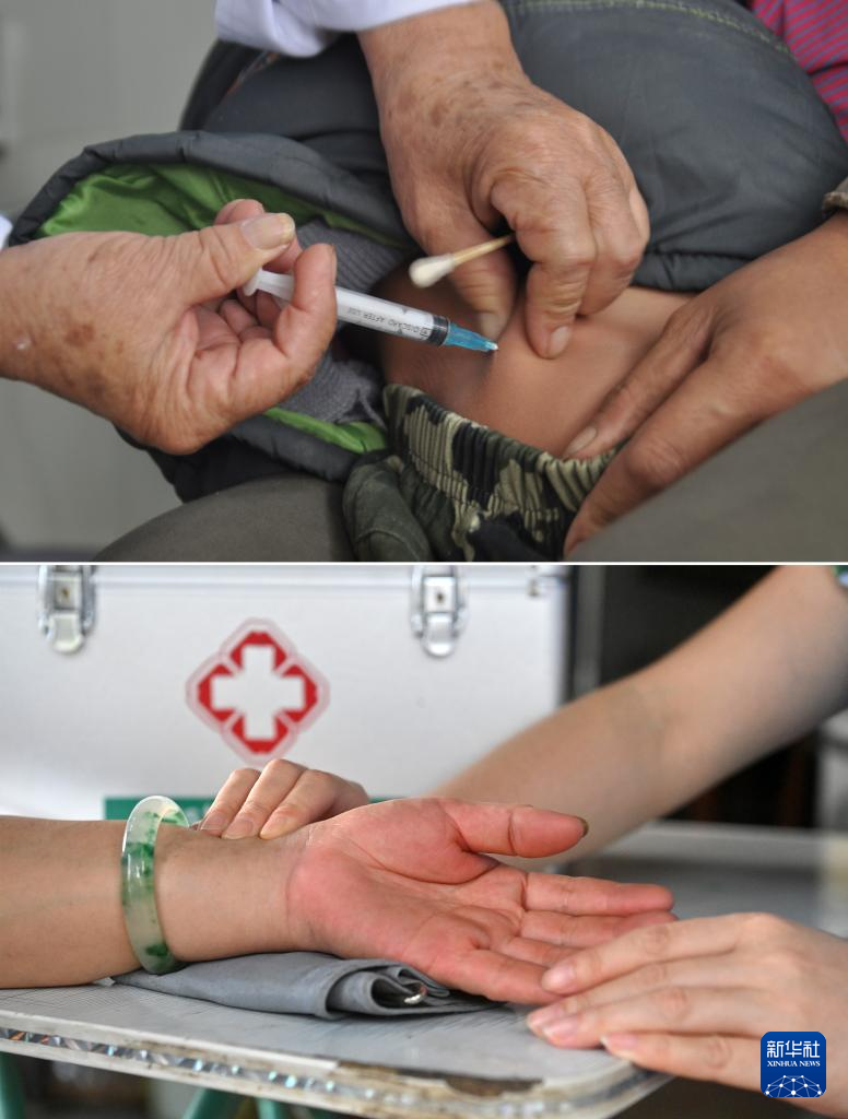 這是一張拼版照片。上圖:杜桂梅醫(yī)生在高嶺村衛(wèi)生室給村民打針(2011年12月7日攝)。下圖:潘雪梅醫(yī)生在高嶺村衛(wèi)生室為村民把脈看?。?025年8月18日攝)。新華社記者 陸波岸 攝