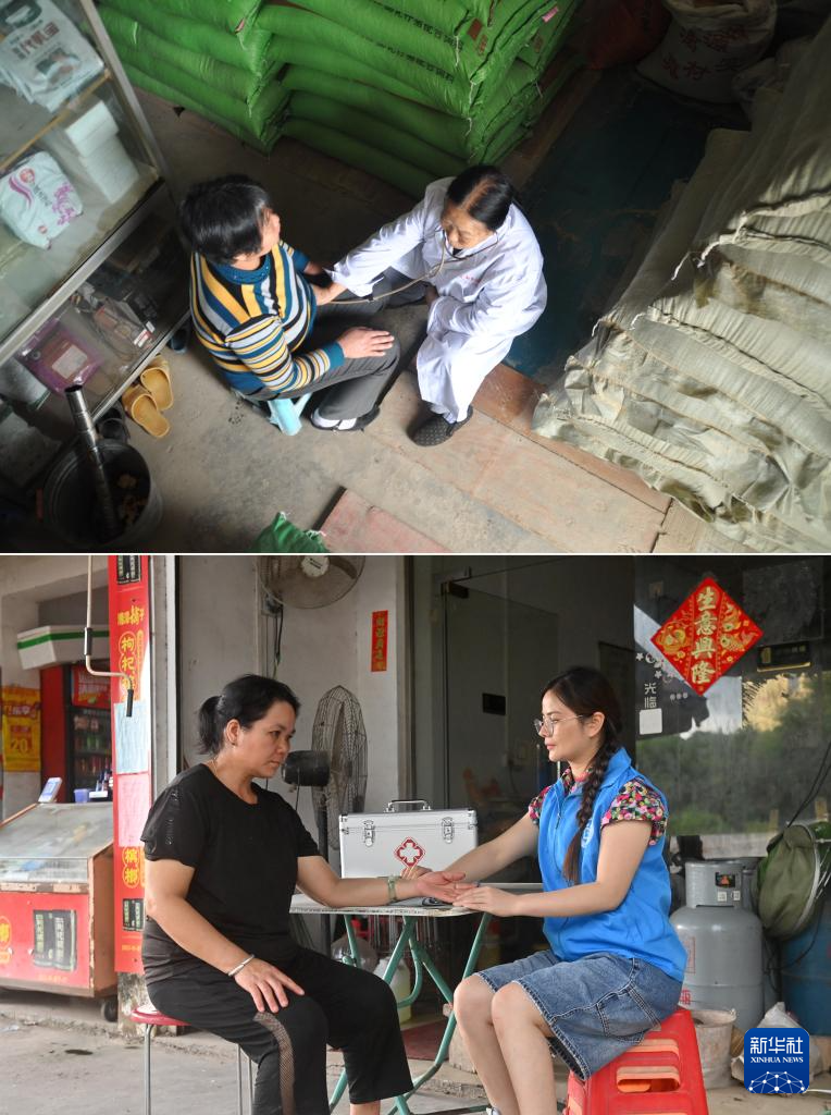 這是一張拼版照片。上圖:在廣西南寧市高嶺村,杜桂梅醫(yī)生(右)入戶為村民檢查身體(2011年12月7日攝)。下圖:潘雪梅醫(yī)生(右)入戶為村民檢查身體(2025年8月18日攝)。新華社記者 陸波岸 攝