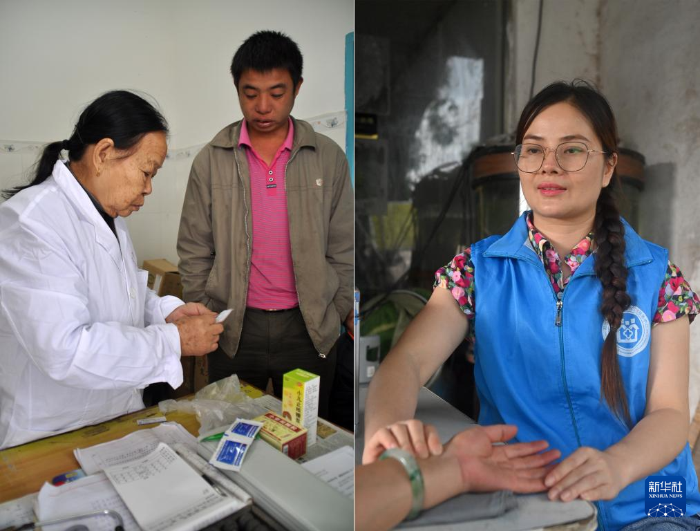 這是一張拼版照片。左圖:在高嶺村衛(wèi)生室,杜桂梅醫(yī)生向村民交代用藥注意事項(xiàng)(2011年12月7日攝)。右圖:潘雪梅醫(yī)生入戶為村民把脈看?。?025年8月18日攝)。新華社記者 陸波岸 攝