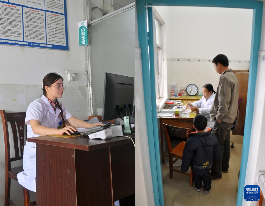 這是一張拼版照片。左圖:在高嶺村衛(wèi)生室,潘雪梅醫(yī)生通過(guò)電腦查閱村民就醫(yī)信息(2025年8月18日攝)。右圖:杜桂梅醫(yī)生向村民交代用藥注意事項(xiàng)(2011年12月7日攝)。新華社記者 陸波岸 攝