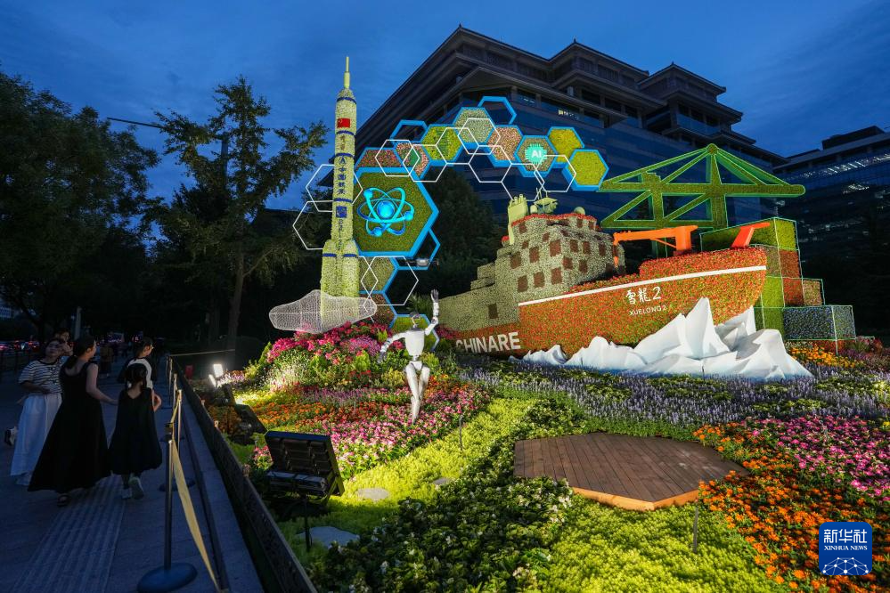 8月22日,人們在北京西單參觀“科技強國”花壇。新華社記者 鞠煥宗 攝