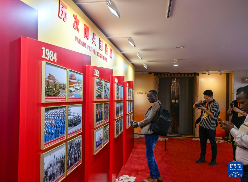 8月28日,記者在新聞中心參觀歷次閱兵圖片展。新華社記者 金良快 攝