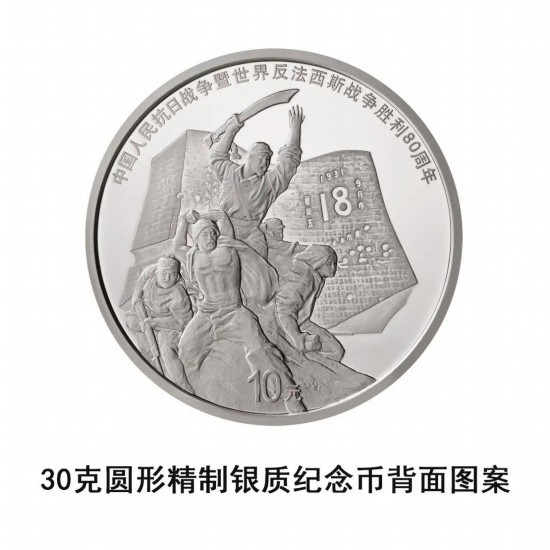 30克圓形銀質(zhì)紀(jì)念幣背面圖案由“大刀進(jìn)行曲”雕塑、“九·一八”歷史博物館“殘歷碑”雕塑等元素構(gòu)成,并刊“中國(guó)人民抗日戰(zhàn)爭(zhēng)暨世界反法西斯戰(zhàn)爭(zhēng)勝利80周年”字樣及面額“10元”字樣。