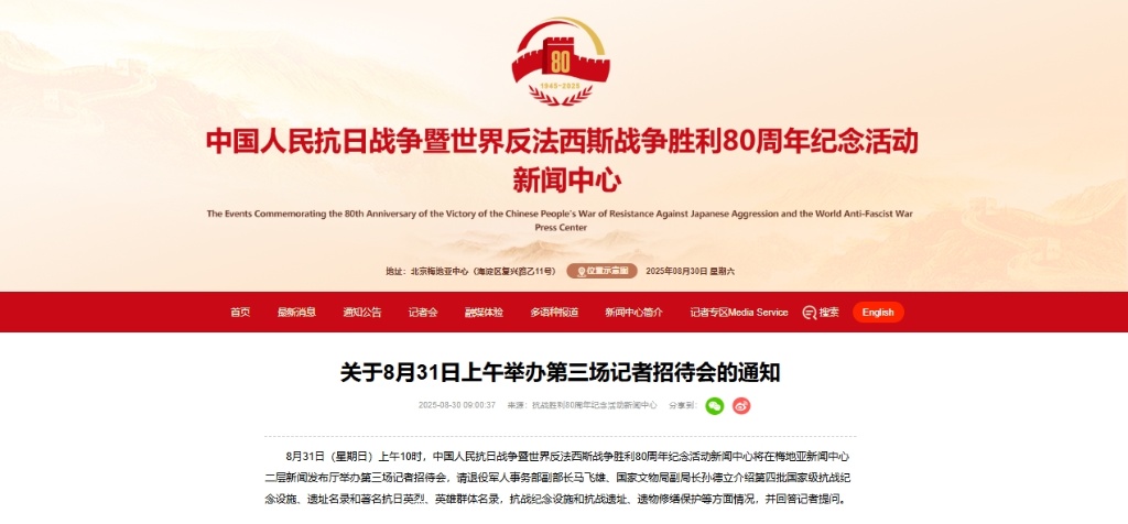 8月31日(星期日)上午10時(shí),中國人民抗日戰(zhàn)爭暨世界反法西斯戰(zhàn)爭勝利80周年紀(jì)念活動(dòng)新聞中心將在梅地亞新聞中心二層新聞發(fā)布廳舉辦第三場記者招待會(huì),請退役軍人事務(wù)部副部長馬飛雄、國家文物局副局長孫德立介紹第四批國家級抗戰(zhàn)紀(jì)念設(shè)施、遺址名錄和著名抗日英烈、英雄群體名錄,抗戰(zhàn)紀(jì)念設(shè)施和抗戰(zhàn)遺址、遺物修繕保護(hù)等方面情況,并回答記者提問。(記者朱高祥)