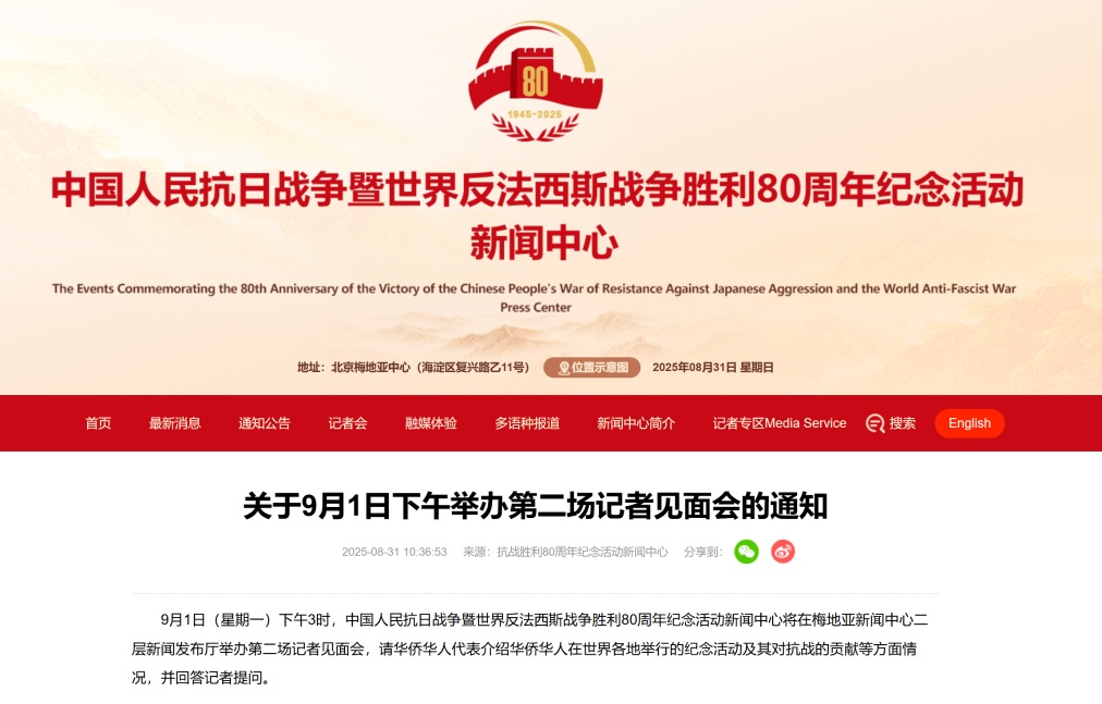 9月1日(星期一)下午3時,中國人民抗日戰(zhàn)爭暨世界反法西斯戰(zhàn)爭勝利80周年紀念活動新聞中心將在梅地亞新聞中心二層新聞發(fā)布廳舉辦第二場記者見面會,請華僑華人代表介紹華僑華人在世界各地舉行的紀念活動及其對抗戰(zhàn)的貢獻等方面情況,并回答記者提問。(記者范思翔)