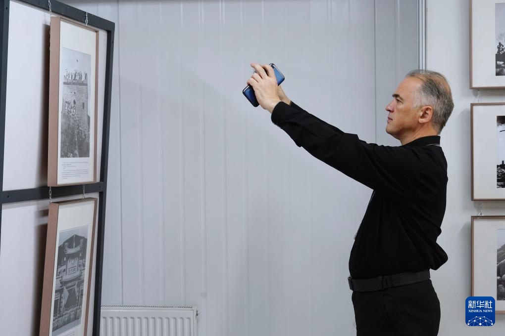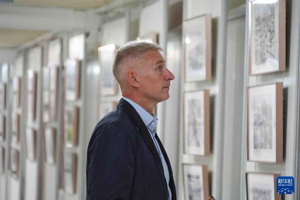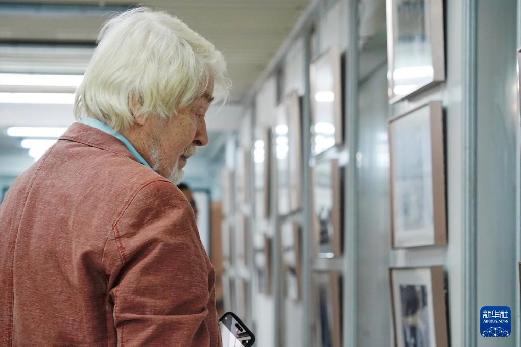 8月28日,在俄羅斯圣彼得堡,一名男子參觀紀念中國人民抗日戰(zhàn)爭暨世界反法西斯戰(zhàn)爭勝利80周年圖片展。新華社記者 周天翮 攝