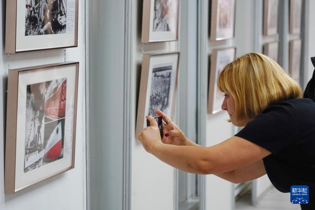 8月28日,在俄羅斯圣彼得堡,一名女子參觀紀念中國人民抗日戰(zhàn)爭暨世界反法西斯戰(zhàn)爭勝利80周年圖片展。新華社記者 周天翮 攝