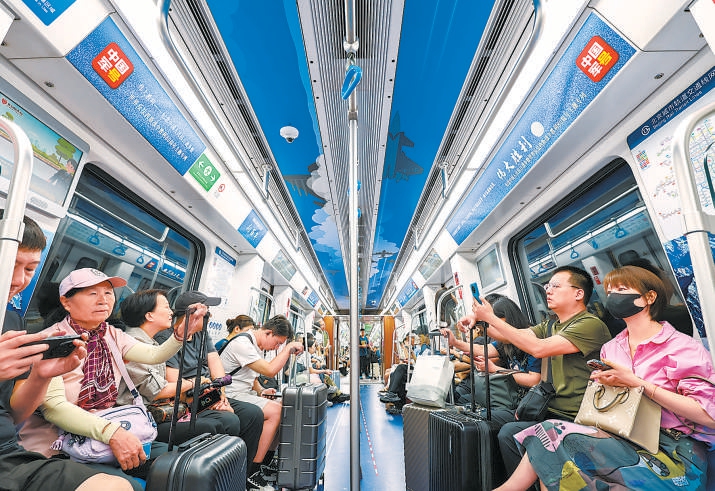 乘客乘坐地鐵19號(hào)線“偉大勝利”主題專列。 北京日報(bào)記者 鄧偉攝