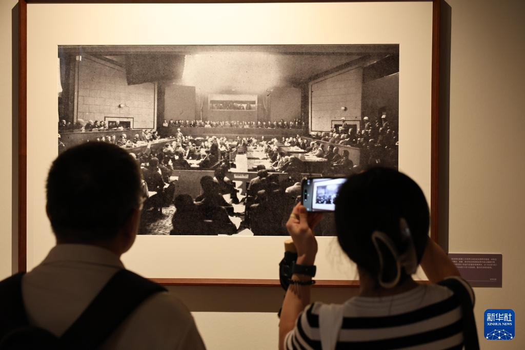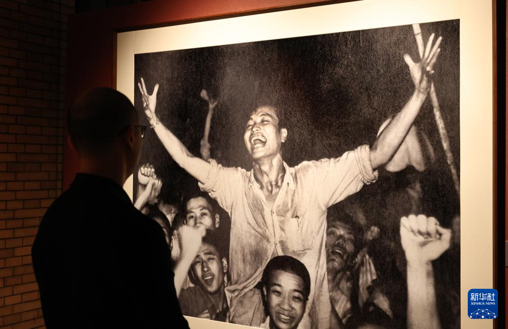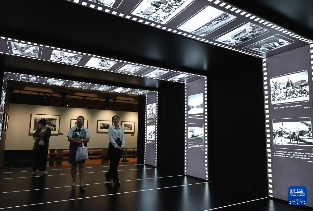 9月1日,參觀者在藝術展上展出的抗戰(zhàn)主題攝影作品前駐足觀看。新華社記者 方喆 攝
