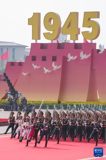 9月3日,紀(jì)念中國(guó)人民抗日戰(zhàn)爭(zhēng)暨世界反法西斯戰(zhàn)爭(zhēng)勝利80周年大會(huì)在北京隆重舉行。這是國(guó)旗護(hù)衛(wèi)隊(duì)在行進(jìn)中。