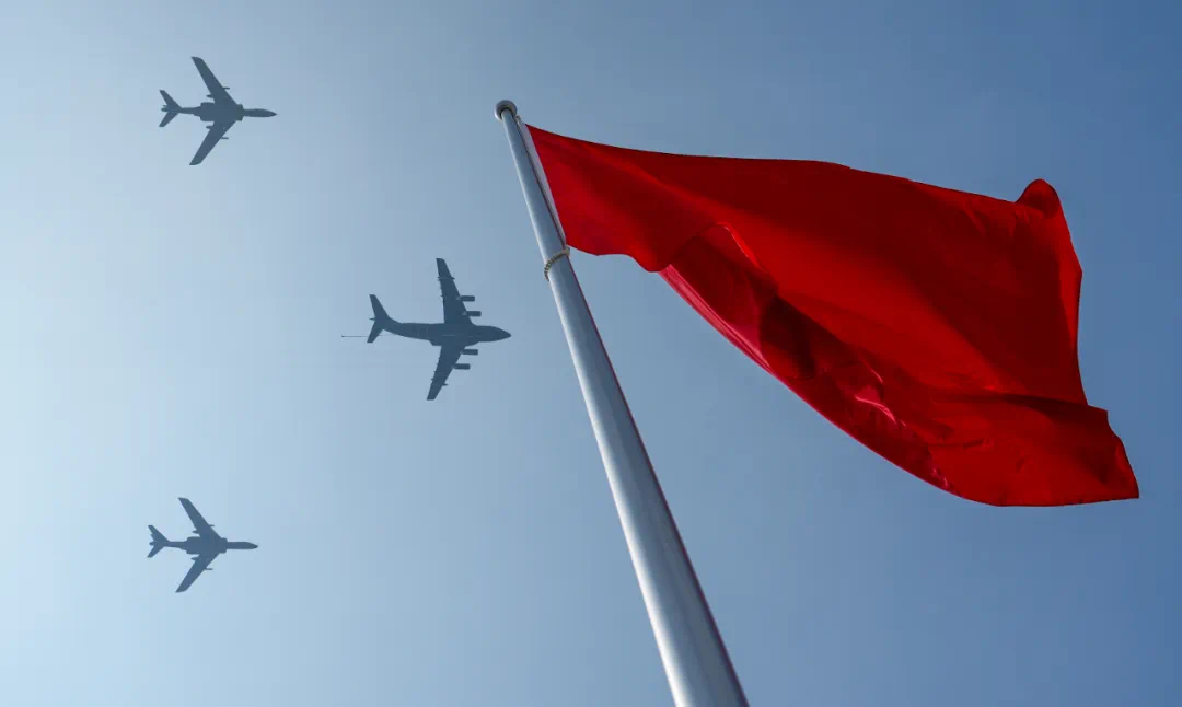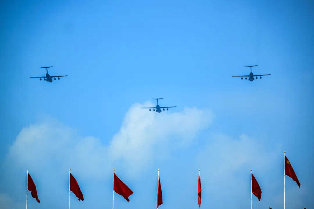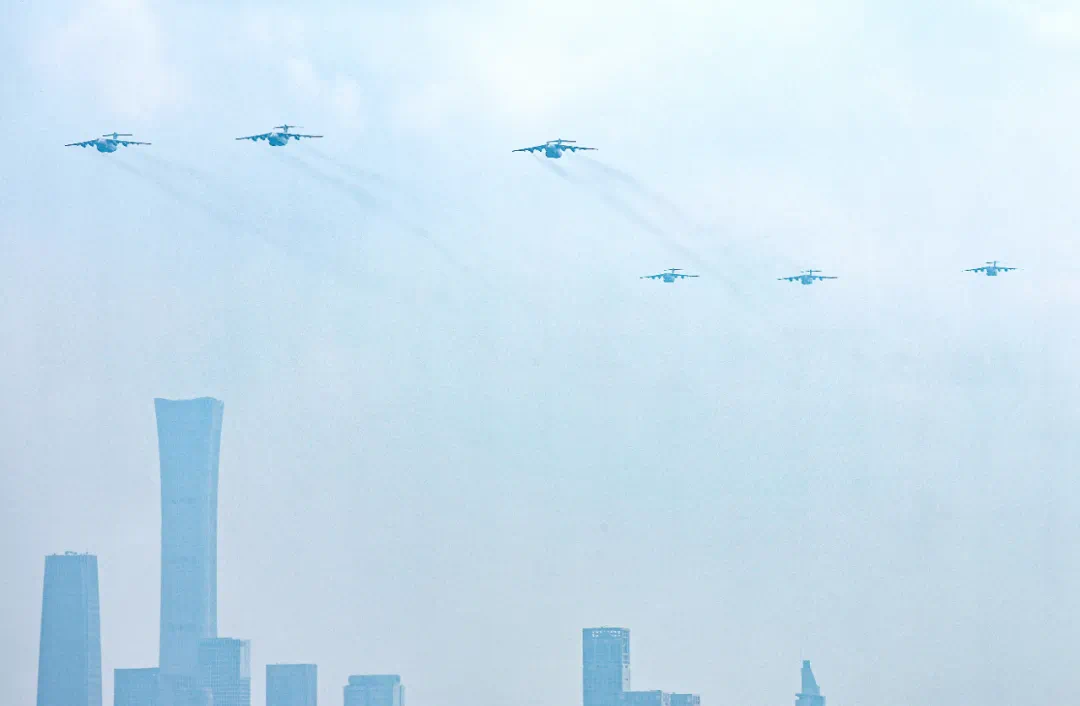 9月3日,紀(jì)念中國人民抗日戰(zhàn)爭(zhēng)暨世界反法西斯戰(zhàn)爭(zhēng)勝利80周年大會(huì)在北京隆重舉行。這是運(yùn)輸機(jī)梯隊(duì)接受檢閱。新華社記者 孫凡越 攝