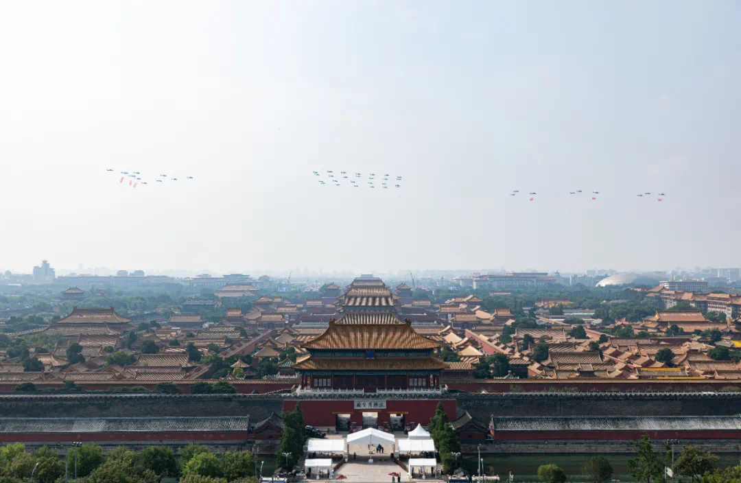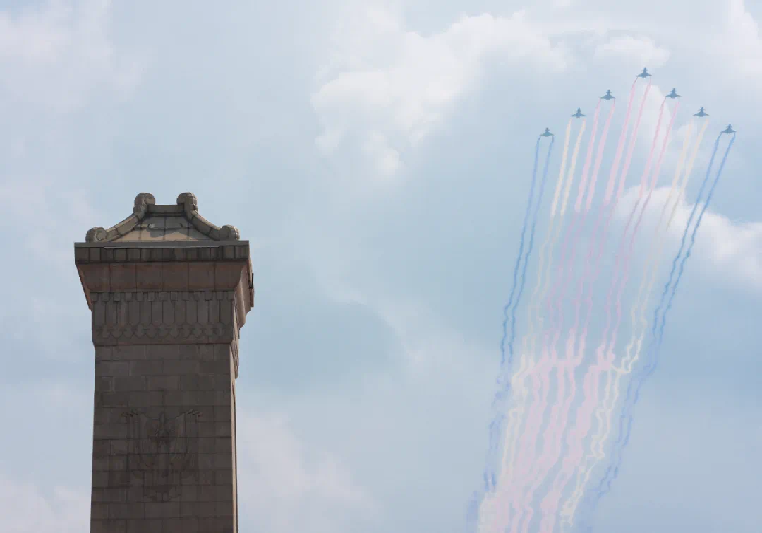 9月3日,紀(jì)念中國人民抗日戰(zhàn)爭(zhēng)暨世界反法西斯戰(zhàn)爭(zhēng)勝利80周年大會(huì)在北京隆重舉行。這是在北京天壇公園拍攝的教練機(jī)梯隊(duì)。新華社記者 趙子碩 攝