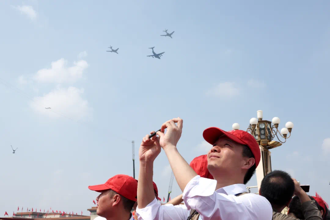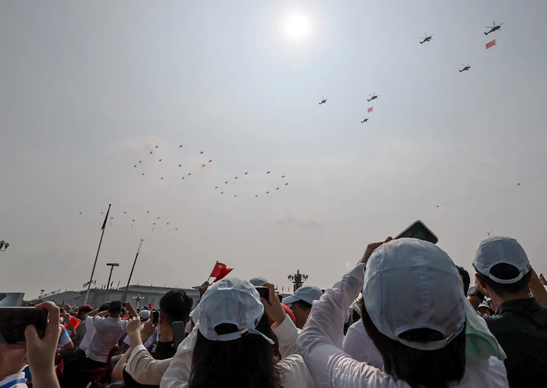 9月3日,紀(jì)念中國人民抗日戰(zhàn)爭(zhēng)暨世界反法西斯戰(zhàn)爭(zhēng)勝利80周年大會(huì)在北京隆重舉行。這是市民在觀看空中梯隊(duì)。新華社記者 陳浩明 攝