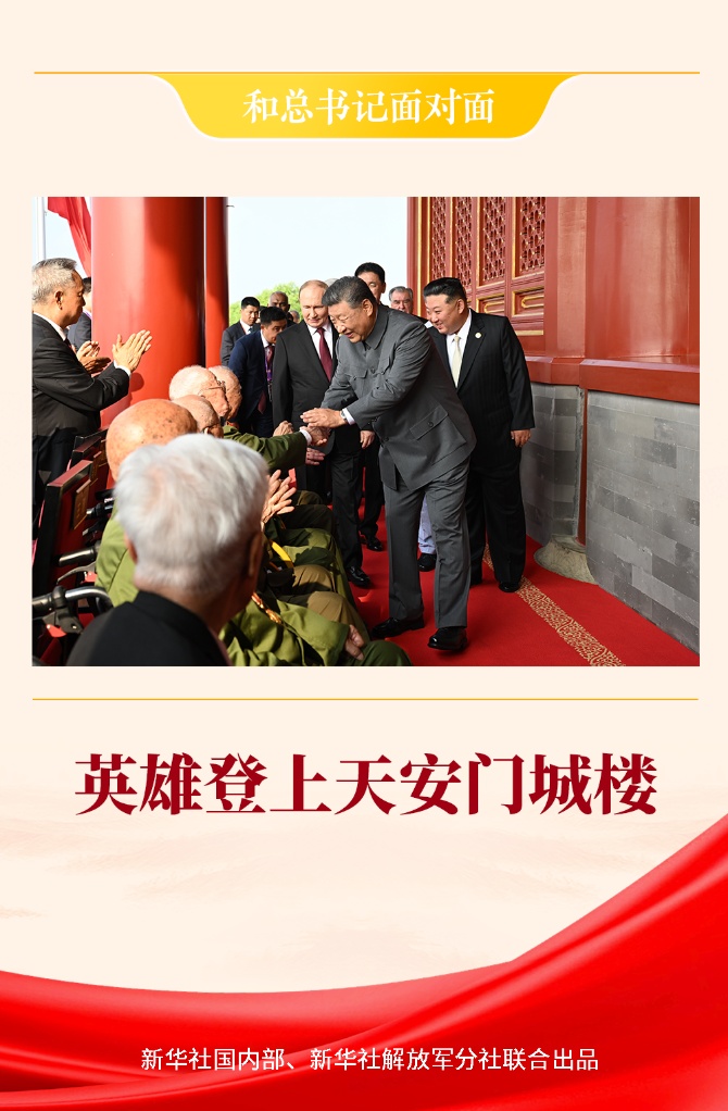 紀(jì)念中國(guó)人民抗日戰(zhàn)爭(zhēng)暨世界反法西斯戰(zhàn)爭(zhēng)勝利80周年大會(huì)開(kāi)始前,習(xí)近平總書(shū)記登上城樓,走到抗戰(zhàn)老戰(zhàn)士老同志面前俯下身來(lái),雙手緊緊握住他們的手,目光深情而溫暖。