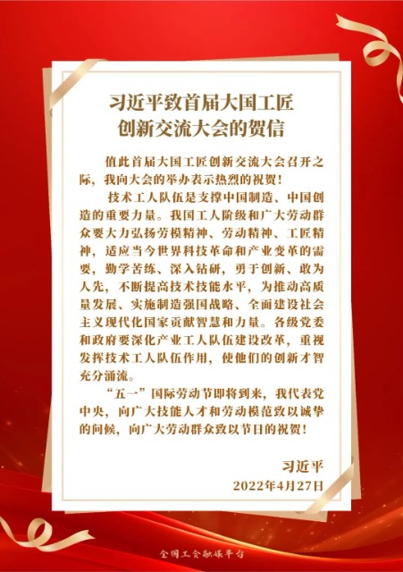 中共中央總書記、國家主席、中央軍委主席習(xí)近平向首屆大國工匠創(chuàng)新交流大會發(fā)來賀信,向大會的舉辦表示熱烈的祝賀,并在“五一”國際勞動節(jié)到來之際,代表黨中央向廣大技能人才和勞動模范致以誠摯的問候,向廣大勞動群眾致以節(jié)日的祝賀。