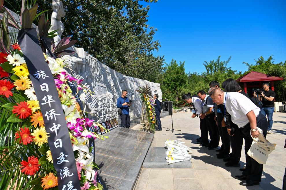 9月18日,中日友好人士在天津“花岡暴動紀念園”獻花鞠躬。新華社記者 孫凡越 攝