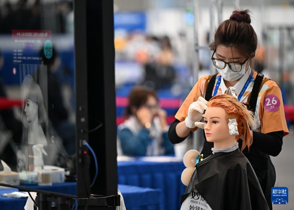 9月20日,選手在美發(fā)項(xiàng)目比賽中。新華社記者 郝源 攝
