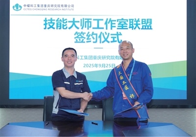 9月25日,大國工匠祁峰(右一)與中煤科工集團重慶研究院有限公司簽訂技能大師工作室聯(lián)盟合作協(xié)議。