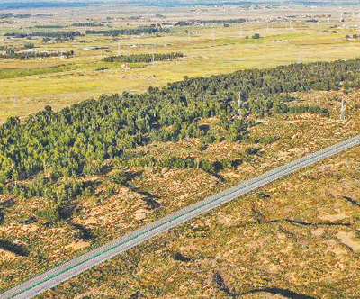 “十四五”時期,“三北”工程攻堅戰(zhàn)取得階段性成效。圖為內蒙古庫布其沙漠北緣鎖邊林帶。新華社記者 李志鵬攝