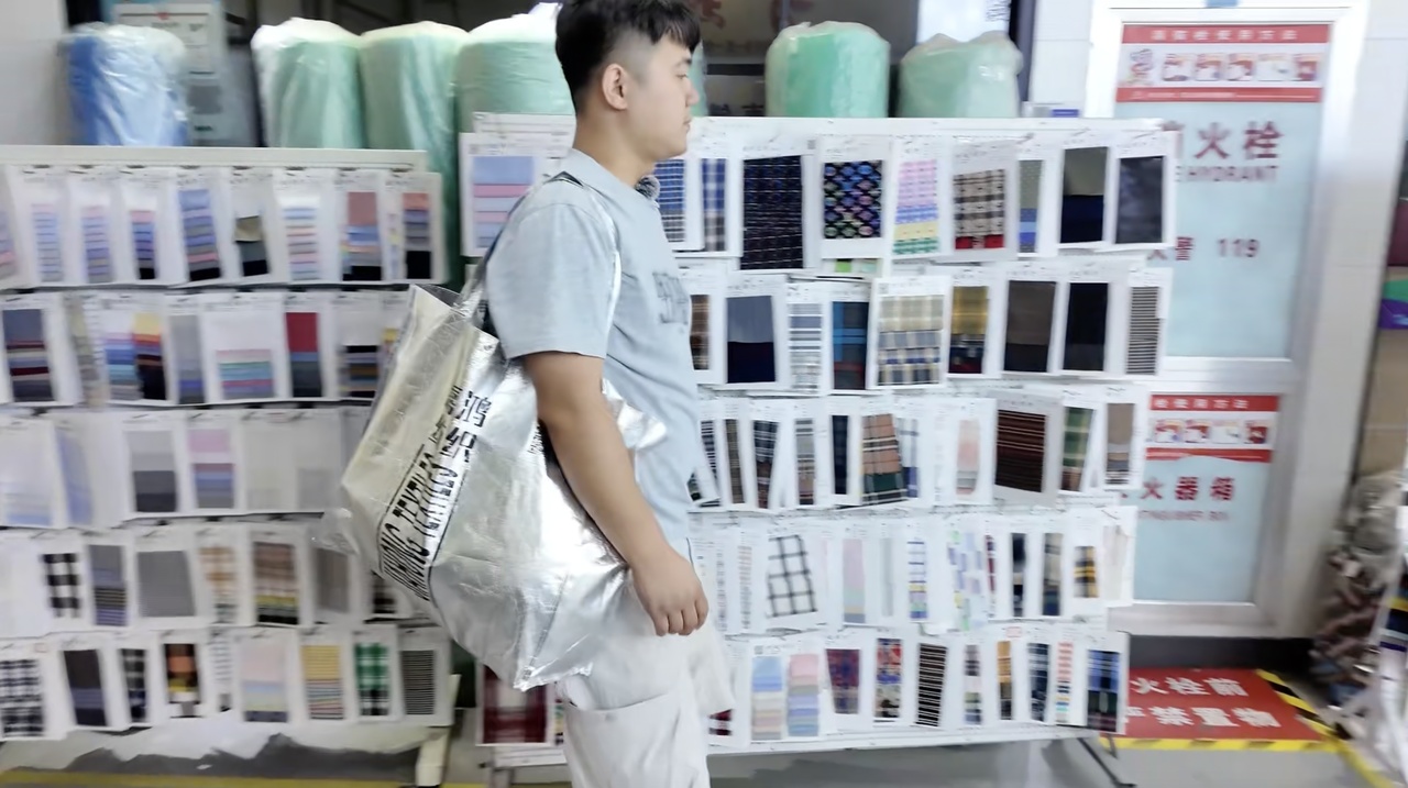 剛?cè)胄袝r(shí)找樣全靠“笨辦法”。劉佩每天從開(kāi)市走到閉市,一家門(mén)市部挨著一家問(wèn),日均步數(shù)最少兩萬(wàn),多則四萬(wàn)?,F(xiàn)在熟悉了,他光憑面料的手感、紋路,就能先鎖定大致市場(chǎng)區(qū)域,再精準(zhǔn)篩選,效率翻了好幾倍。