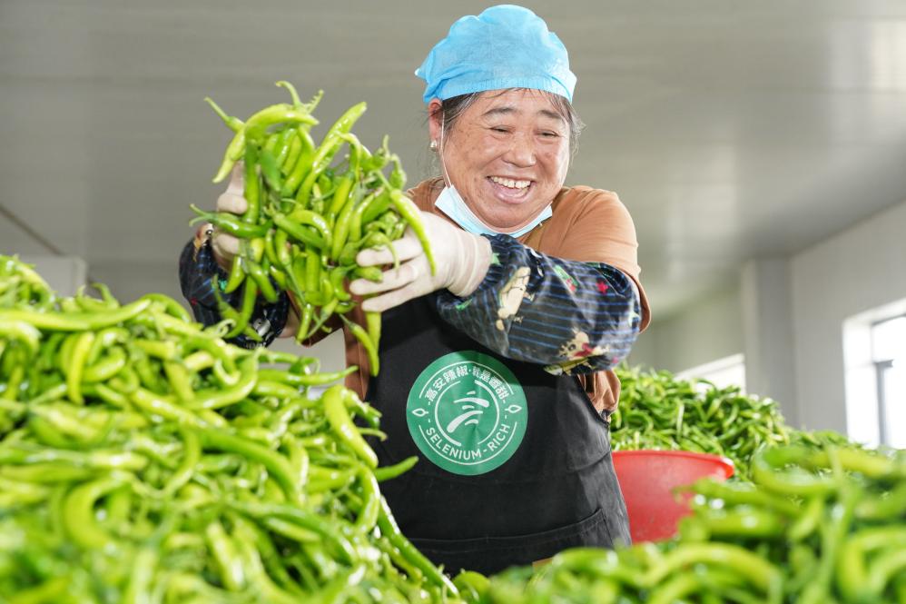 ??當(dāng)?shù)亟ㄔO(shè)的2000畝高標(biāo)準(zhǔn)蔬菜大棚已投入使用,逐漸在鄉(xiāng)域內(nèi)形成以辣椒產(chǎn)業(yè)園為中心,向精深加工、智慧農(nóng)業(yè)、鄉(xiāng)村旅游等多方輻射的全產(chǎn)業(yè)鏈模式。目前產(chǎn)業(yè)園帶動(dòng)周邊鄉(xiāng)鎮(zhèn)百姓務(wù)工300余人,帶動(dòng)富硒辣椒種植約1萬(wàn)戶,每年畝產(chǎn)平均收入達(dá)到1.3萬(wàn)元。