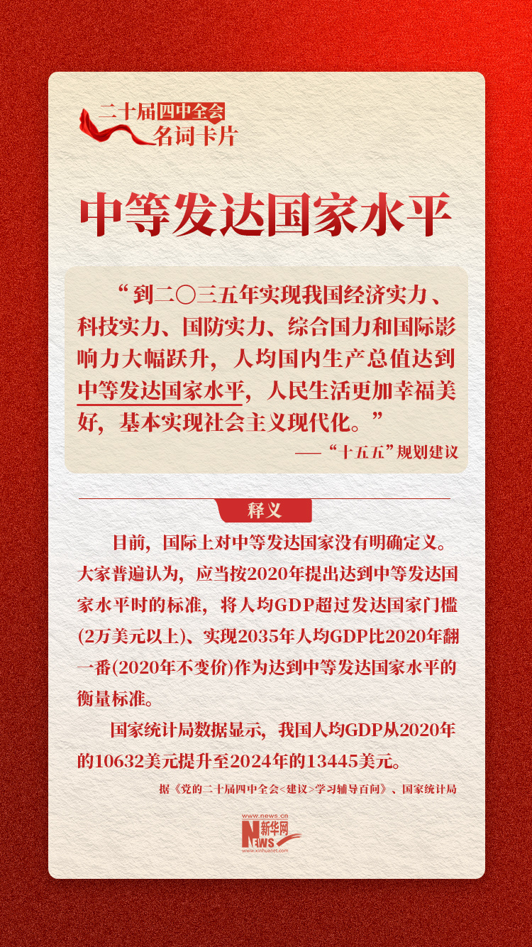 黨的二十大圍繞基本實(shí)現(xiàn)社會(huì)主義現(xiàn)代化,從8個(gè)方面進(jìn)一步明確到2035年我國(guó)發(fā)展的總體目標(biāo),其中第一個(gè)方面就是“經(jīng)濟(jì)實(shí)力、科技實(shí)力、綜合國(guó)力大幅躍升,人均國(guó)內(nèi)生產(chǎn)總值邁上新的大臺(tái)階,達(dá)到中等發(fā)達(dá)國(guó)家水平”。