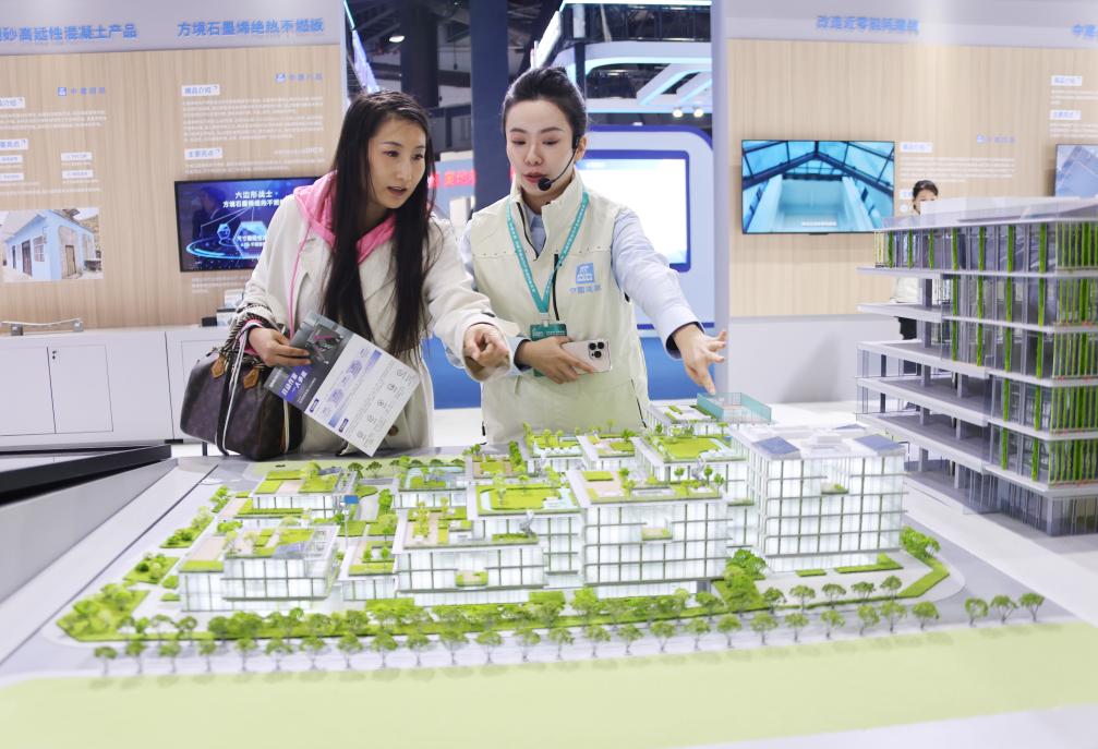 11月6日,講解員(右)在住博會上向觀眾介紹展出的節(jié)能建筑。新華社記者 潘旭 攝
