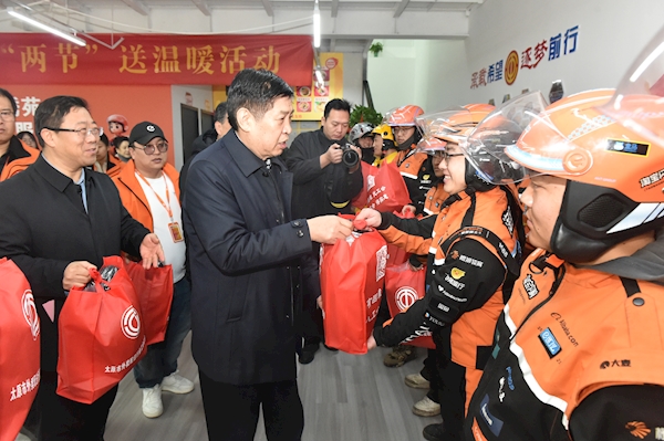 中工網訊 12月19日上午,山西省人大常委會副主任、省總工會主席王純帶隊開展“兩節(jié)”送溫暖活動,先后赴太原市政集團建設有限公司、太原市外賣配送行業(yè)工會聯(lián)合會千禧·錦繡苑騎手安全健康服務站,慰問困難企業(yè)、困難職工和勞模代表,送上慰問金和慰問品,并同步開展新就業(yè)形態(tài)勞動者大慰問大走訪工作,與外賣配送行業(yè)的新就業(yè)形態(tài)勞動者座談交流,傳遞黨和政府及工會組織的關懷與溫暖。