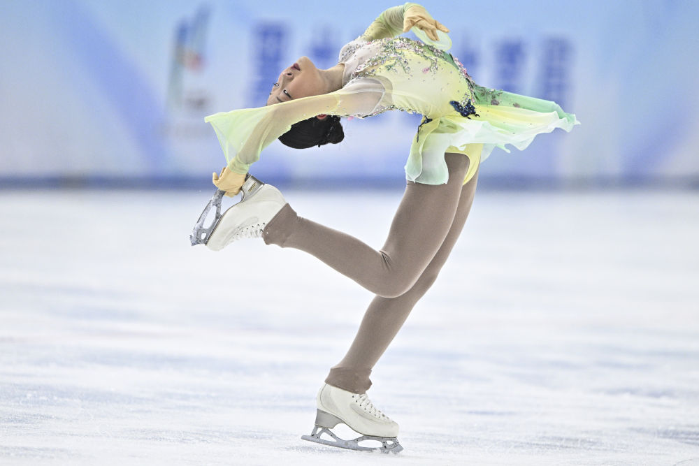 女單自由滑比賽隨后進(jìn)行,14歲小將金書(shū)賢以208.85的總分獲得冠軍,張瑞陽(yáng)和朱易分列第二、三位。