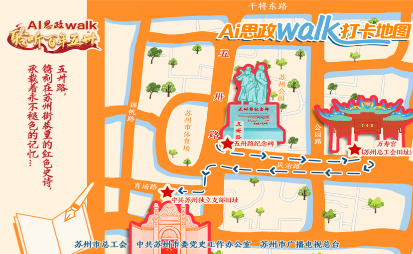 ?線下“行走的課堂”:全國(guó)唯一的五卅路成了“天然課堂”,串聯(lián)起五卅路紀(jì)念碑、萬(wàn)壽宮(蘇州總工會(huì)舊址)、中共蘇州獨(dú)立支部等紅色地標(biāo),設(shè)計(jì)出“思政WALK地圖”。職工每到一處,可聆聽(tīng)學(xué)者講解、觀看勞模情景演繹,并通過(guò)掃碼闖關(guān)答題,深度融入歷史情境。